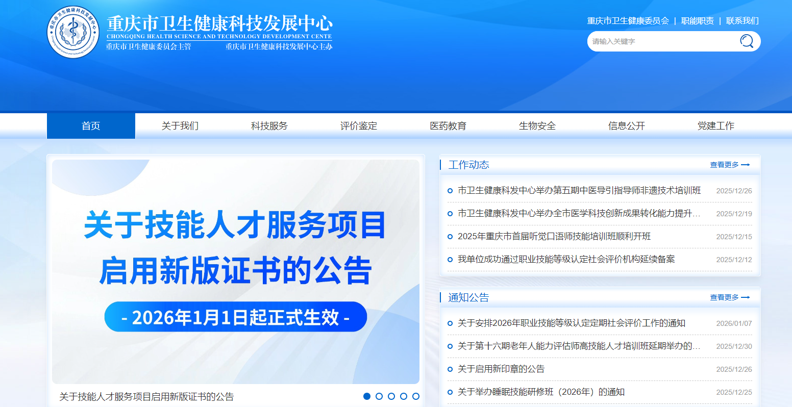 经市委编办批复,重庆市卫生健康委员会国家职业技能鉴定所更名为重庆市卫生健康科技发展中心,为重庆市卫生健康委员会直属正处级公益二类事业单位。现结合工作实际,就单位官方网站重庆市卫生健康技能人才网更名升级相关事项通知如下:
