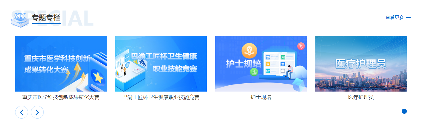 5.专题栏目区,整合本单位承办的重庆市医学科技创新成果转化大赛、“巴渝工匠杯”卫生健康职业技能竞赛、重庆市护士规范化培训、医疗护理员管理等相关业务入口。