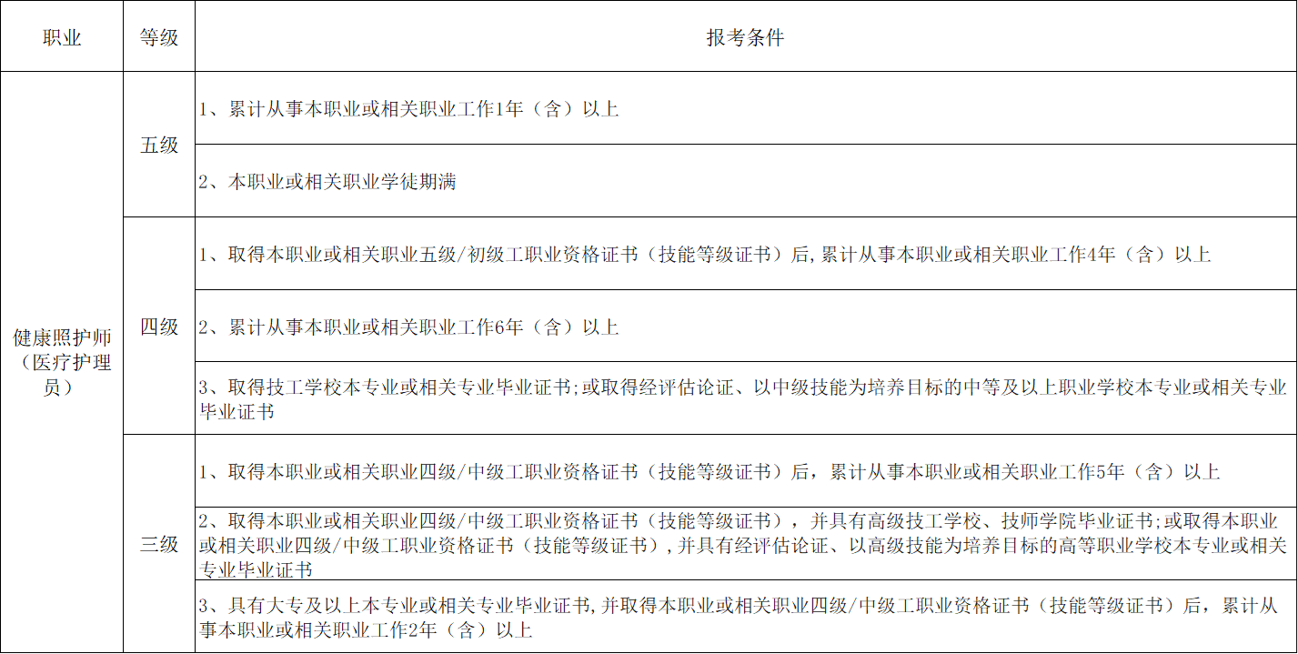 健康照护师(医疗护理员)(三级、四级、五级)报考条件